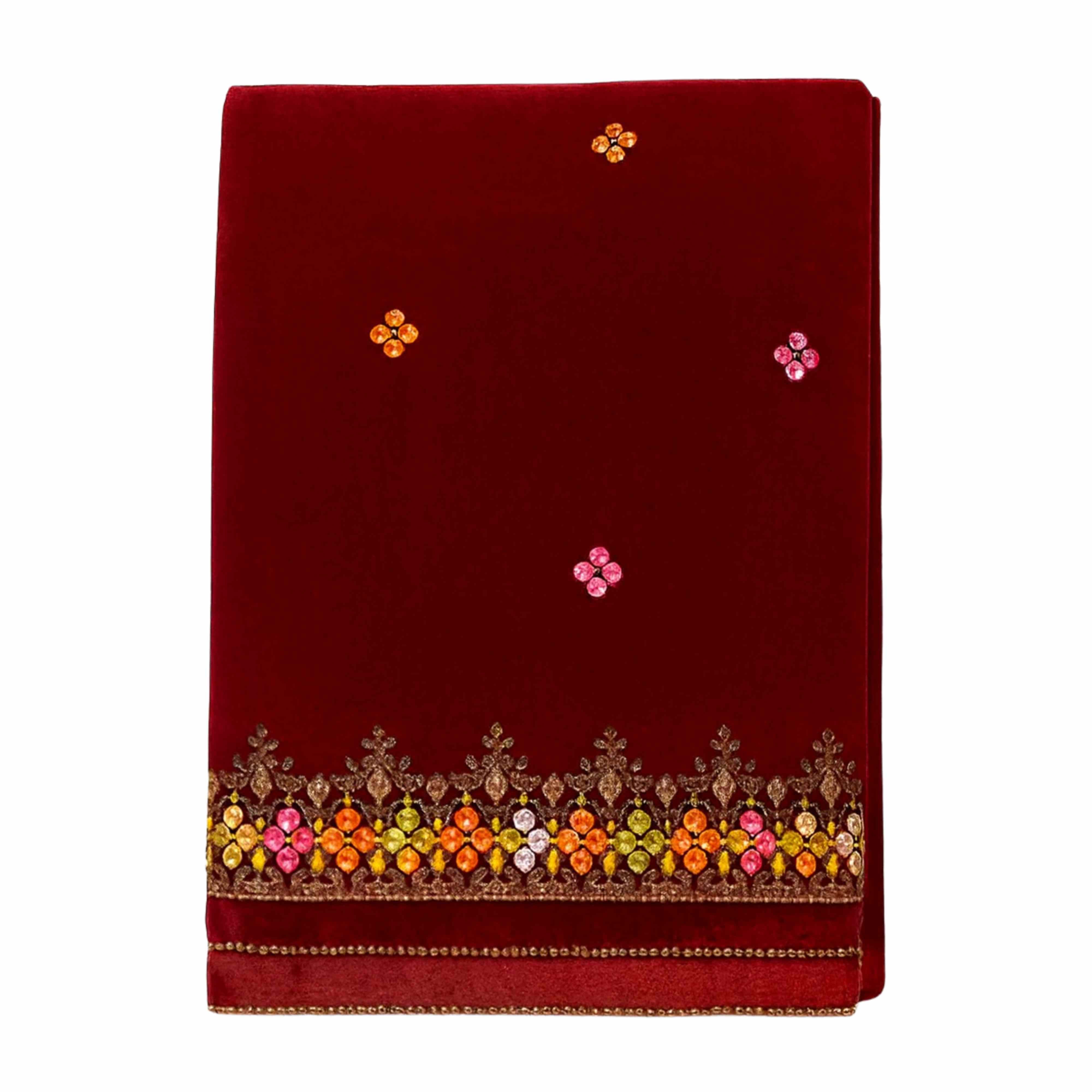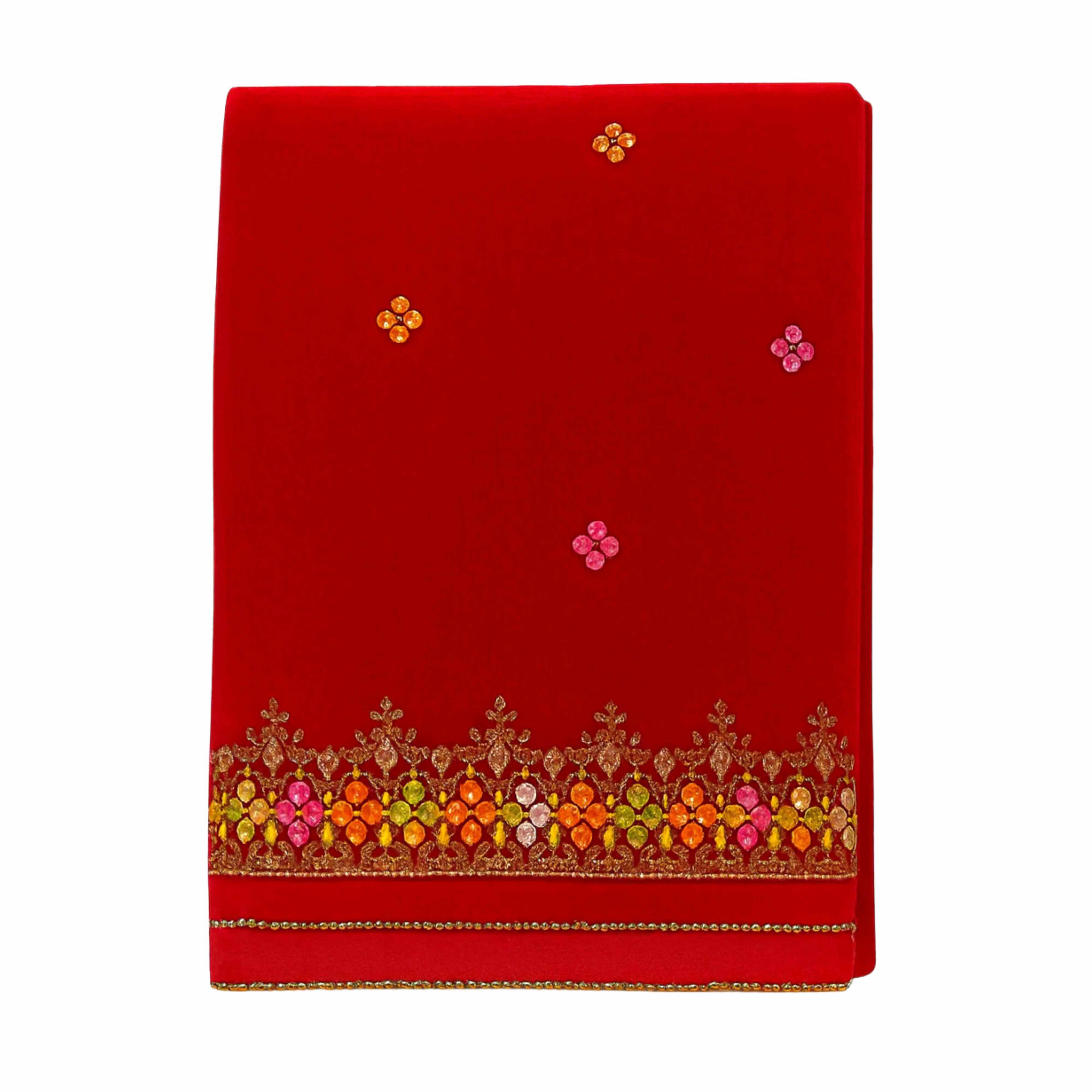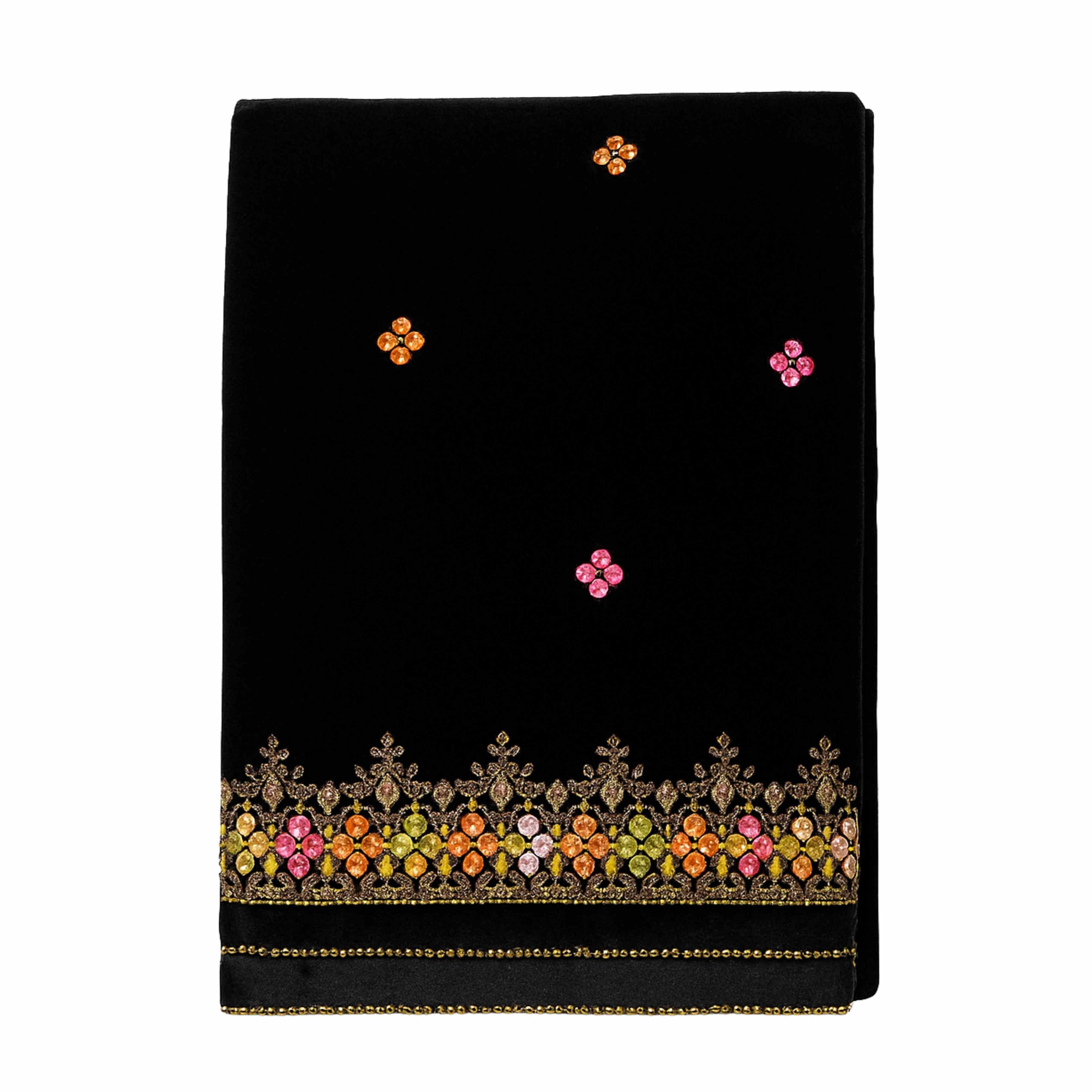 Upgrade your festive and formal wardrobe with this stunning Velvet Multi-Embroidered Border Dupatta Shawl – 2.5 Gazz, crafted for women who love timeless elegance. The luxurious velvet gives a rich, royal feel, while the beautifully detailed multi-color stone and thread embroidery along the border adds the perfect pop of color.